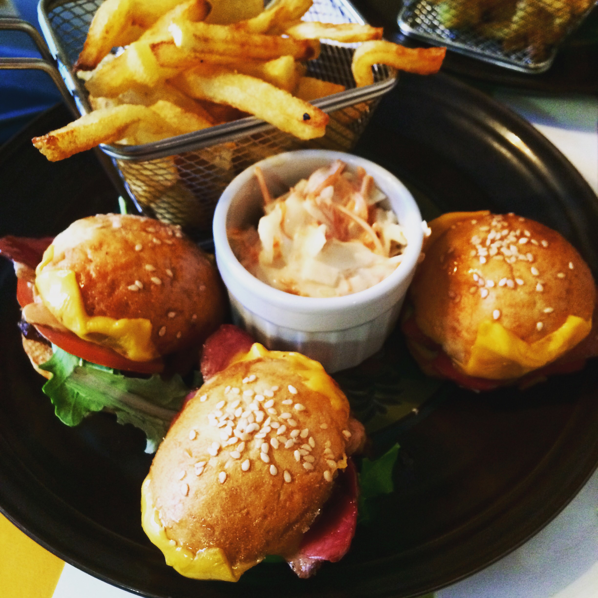 Nous enchaînons sur un trio de mini-burger chacune, un au poulet, l’autre au magret de canard et foie gras. Très sympas ! Et les frites maison sont délicieuses.